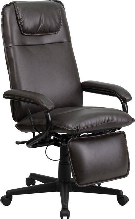 contemporary office chair. Featuring an easy touch height adjustable footrest lever for all-day comfort. Made from brown leather soft Upholstery and polyurethane for added Softness and Durability.
